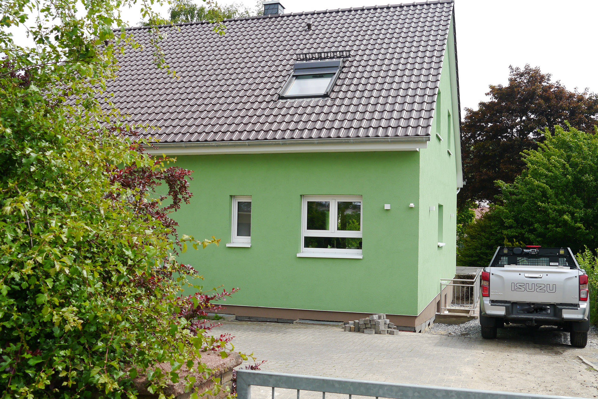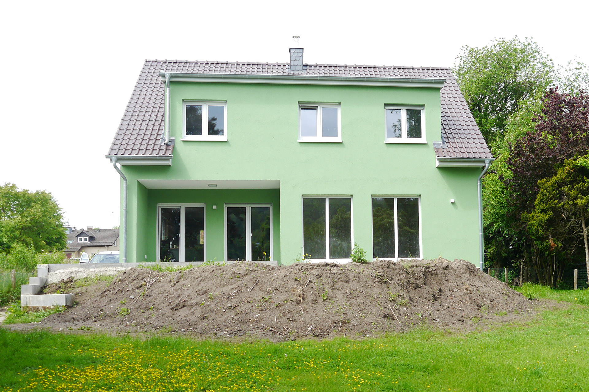 Einfamilienhaus mit einer Wohn- und Nutzfläche von ca. 243,19 m², die Farbgebung erfolgte in einem grasgrünen Ton.
